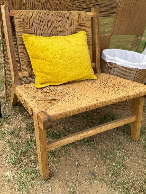 Poltrona elaborada en madera maciza de petiribí, reconocida por su gran resistencia, estabilidad y veta natural cálida. El asiento y respaldo están tejidos a mano en hilo kraft, formando un diseño artesanal que aporta textura y carácter a cualquier ambiente.