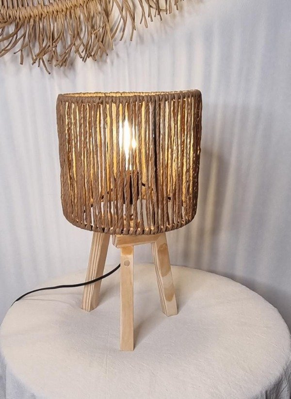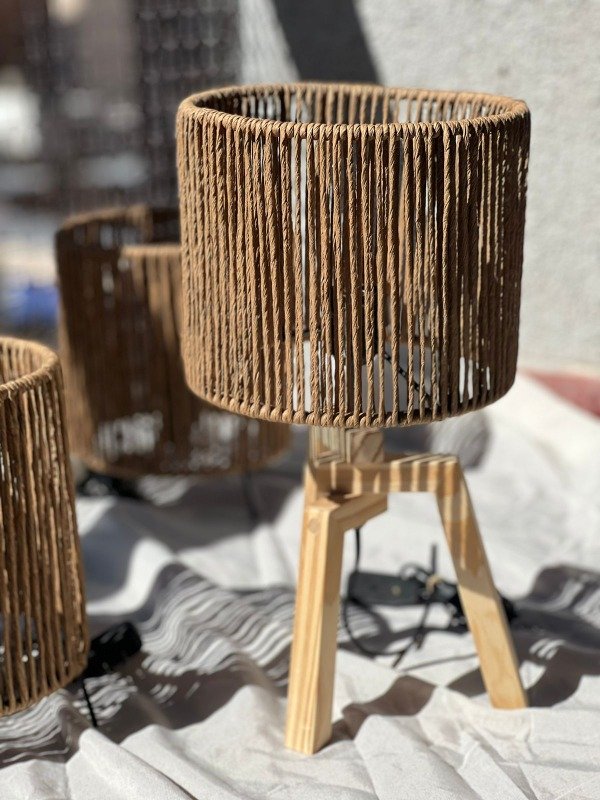 Realizado en madera de pino, encordado en hilo kraft de 4mm color natural. Incluye instalación eléctrica.